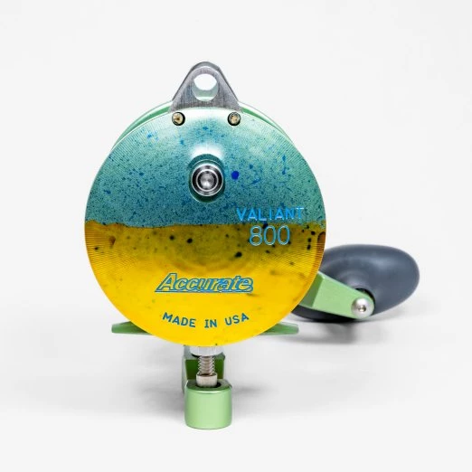 The Accurate Boss Valiant BV2-800 2-Speed Lever Drag Reel is your go-to tuna chunking, and wahoo reel! A testament to American ingenuity, the BV2-800 will take your offshore fishing to the next level! Fishing reels have been getting significantly lighter while strength and power has increased. Accurate has been leading the way with its Valiant platform. The BV2-800 is 30% lighter than the BX2-30! That is mindblowing! At just 25 ozs, you can fish the BV2-800 on a new generation rod for some of your favorite pelagics, including shark! You’ll be able to fish longer and have more fun. If you love offshore fishing, you have to add a BV2-800 to your arsenal! It’s smooth, powerful and can handle almost any fish that hits your line! This reel is constructed of aluminum with stainless steel gears, stainless steel ball bearings and a 2-speed mechanism that allows you to quickly switch from a 5:1 gear ratio to a low 2.2:1 gear ratio for more power. With their TwinDrag system, they put out 36+ lbs of drag. The engineers at Accurate overbuilt the anti-reverse system so a failure is virtually impossible. With thinner braids like Powerpro Maxcuatro you can get a lot of line on a smaller reel and further downsize your tackle. If you’re looking for a new offshore reel, an Accurate Boss Valiant BV2-800 2-Speed Lever Drag Reel is the way to go.