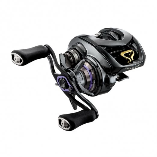 Daiwa Steez CT SV Baitcasting Reels are available in 6.3:1 and 8.1:1 gear ratios. Each comes in right and left handed models. They are gunmetal with purple accents.